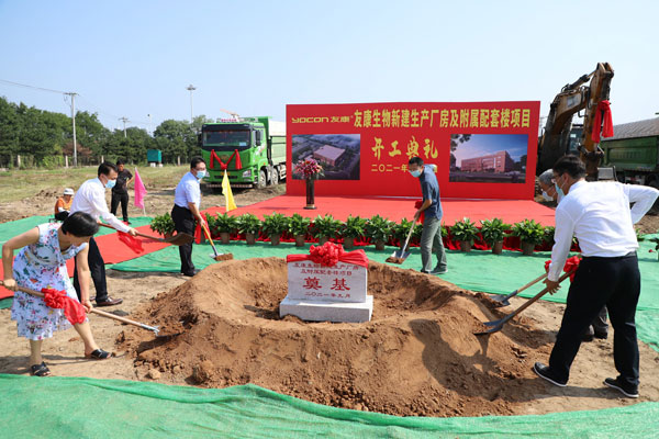 南通三建团股份有限公司副总经理梁总,以及信息产业电子第十一设计研究院科技工程股份有限公司北京分院院长李院长也分别进行了简短有力致辞后,大会开始最重要环节——友康生物总经理曲总宣布友康新建生产厂房及附属配套楼项目开工,并请在场各位领导到工地现场对友康生物新建生产厂房及附属配套楼项目奠基培土。